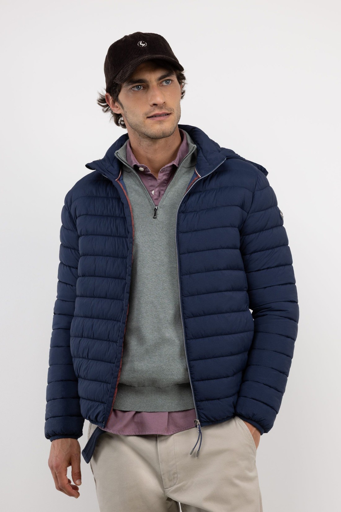 Chaqueta acolchada en tono marino con diseño sencillo y estructura ligera, ideal para aportar abrigo sin excederse.