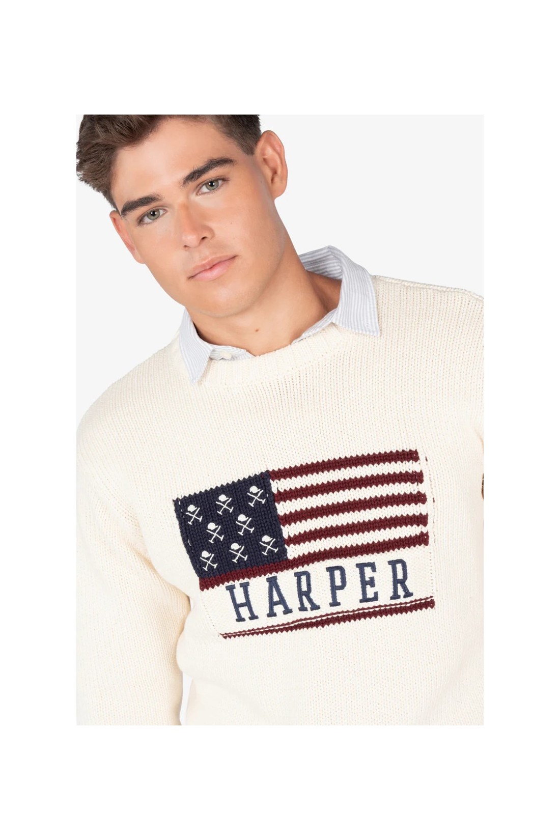 Este jersey de Harper & Neyer presenta un estampado de bandera y calavera que combina estilo y personalidad. Una prenda que destaca por su carácter rebelde y su aire moderno.