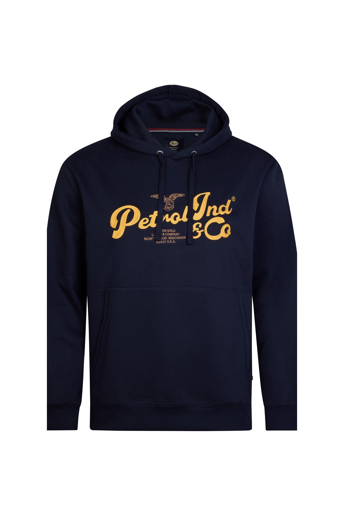Sudadera azul marino de Petrol Industries con capucha ajustable y logo amarillo. Diseño cómodo y actual para tu día a día.