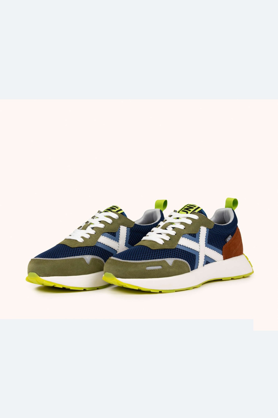 Zapatillas Munich en azul, verde y marrón con estilo deportivo elegante, ideales para looks urbanos cómodos y con personalidad.